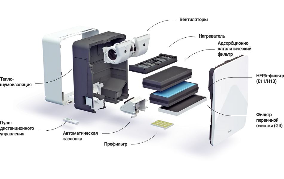- обеззараживание за счет замещения внутреннего воздуха чистым приточным, снижение концентрации углекислого газа - свежий воздух 24/7;