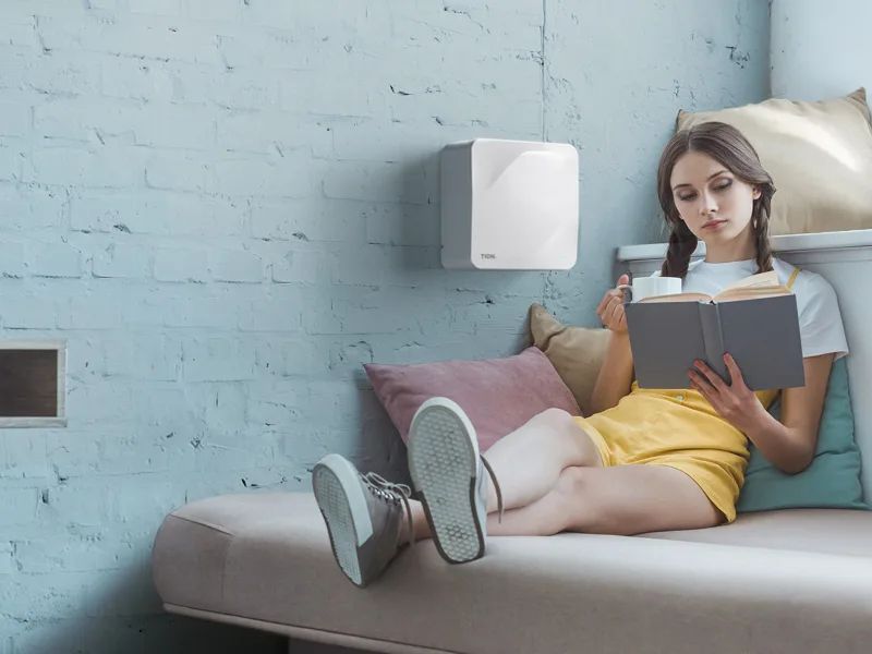 TION Бризер Lite - суперкомпактный (размеры всего 26 × 26 × 13 см) приточный очиститель воздуха с эффективной фильтрацией от пыли и аллергенов, защитой от шума с улицы и управлением со смартфона. Найти в квартире место для такого компактного аппарата не составит труда. Его можно установить под батарею, в углу, рядом с подоконником и т.д. Окна закрыты, в помещении тихо, но оно эффективно проветривается, при этом фильтр класса G4 против пыли (или EPA фильтр класса E11 от мельчайшей пыли и аллергенов) очищает поступающий воздух, а в холодное время года воздух еще и подогревается.